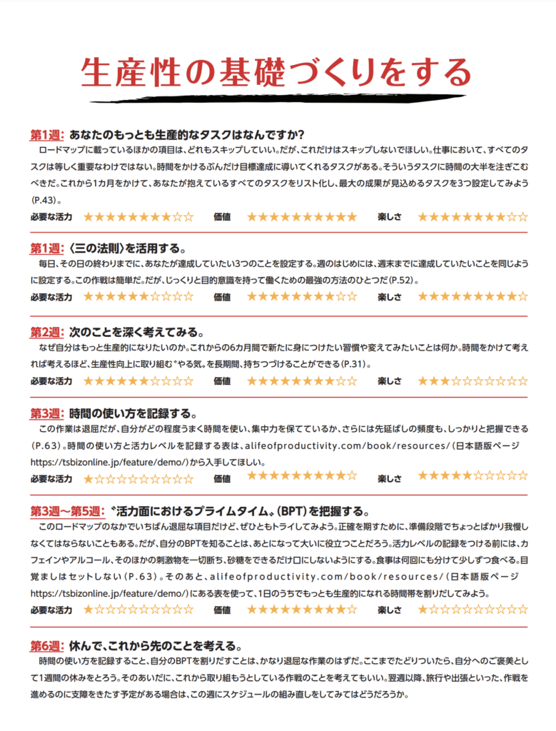 こちら役に立つ内容ばかりの神本だったので、生産性に興味のある人にはぜひ読んで欲しいところですが、エッセンスがまとまったPDFを見つけましたので、リンクを張っておきます。