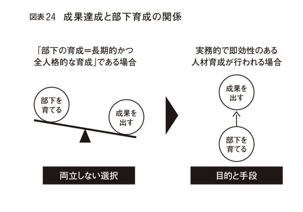 つまり、部下を育成しても仕事の成果には「当面の間」つながらないという前提がありそうです。